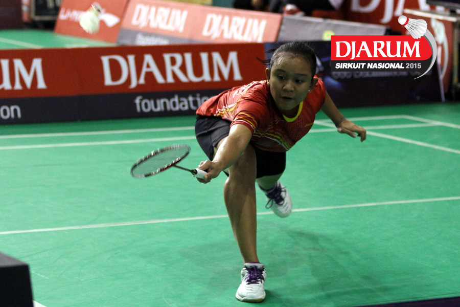 Tria Nur (Pusdiklat Telkom Jabar) mengembalikan shuttlecock