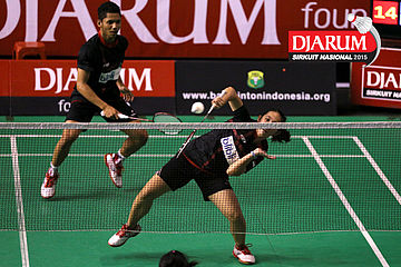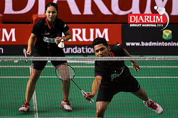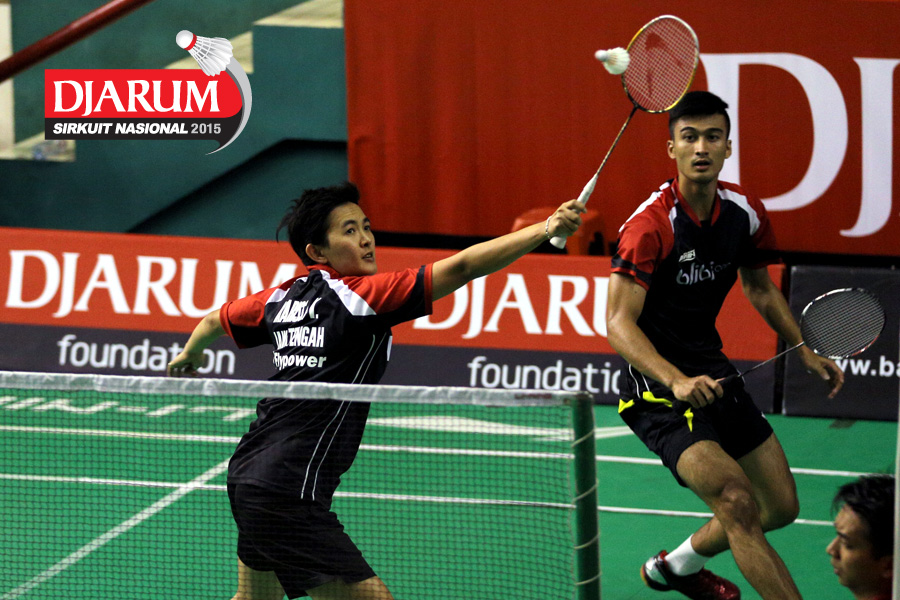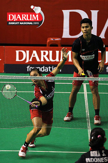Ardy Nugroho/Lisa Ayu (Djarum Kudus) bersiap menyambar pengembalian