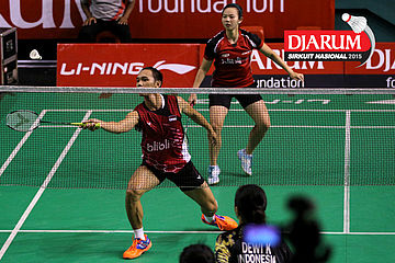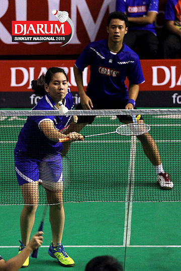 Fran Kurniawan/Komala Dewi (Djarum Kudus) bersiap menghadang serangan