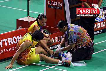 Zachariah Josiahno/Winny Oktavina (Tangkas) menerima perawatan medis