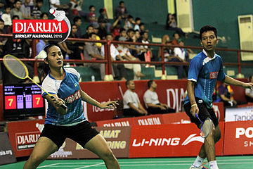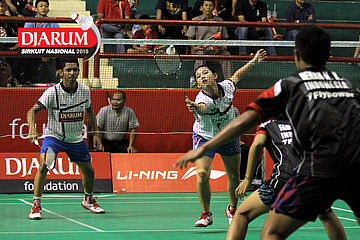 Rehan Naufal/Siti Fadia (Djarum Kudus) mengembalikan shuttlecock