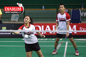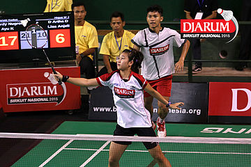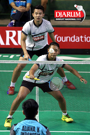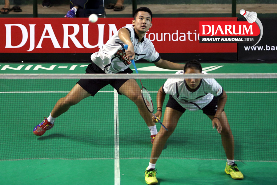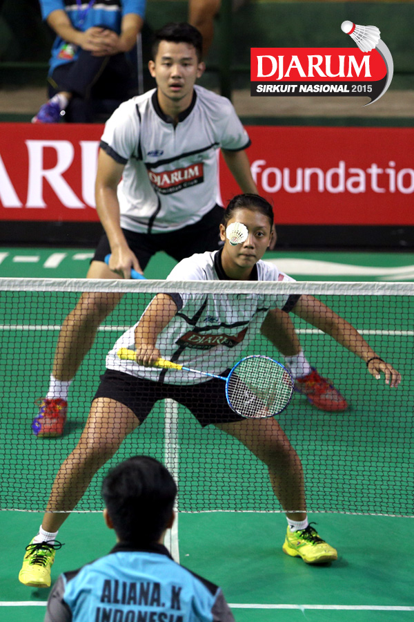 Ardy Nugroho/Lisa Ayu (Djarum Kudus) mengembalikan shuttlecock.