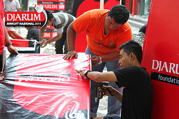 Dua pekerja saat membuka lipatan giant banner Djarum Sirkuit Nasional 2014.