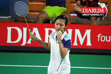 Karina Ria/Wulan Cahya (PB Djarum) mengembalikan shuttlecock ke arah Ni Made Pranita/Sarah Christin (Pelatprov Bali/Pelatprov DKI Jakarta).