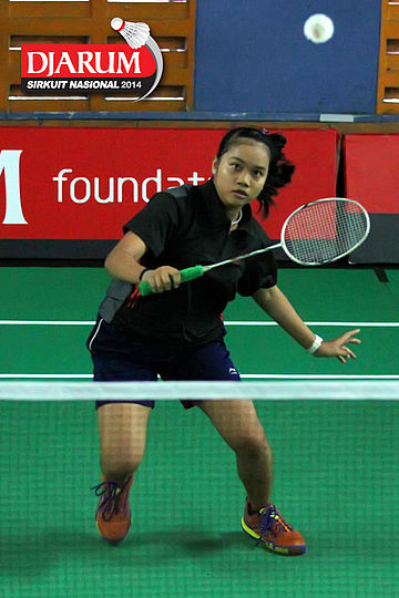 Dina Iqomah (Banda Baru Batam) bersiap mengembalikan shuttlecock ke arah Adinda Putri (Tangkas).