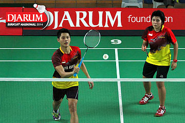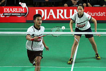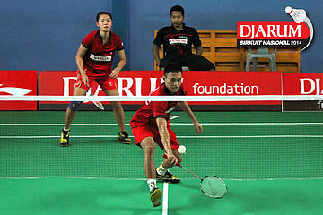 Ridho Bianto/Rahmadhani Hastiyanti (PB Djarum) melepaskan serve.