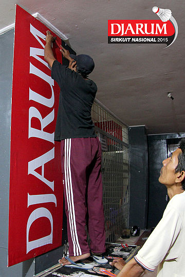 Dua pekerja saat memasang perlengkapan dekorasi Djarum Sirkuit Nasional Li-Ning NTB Open 2015