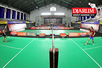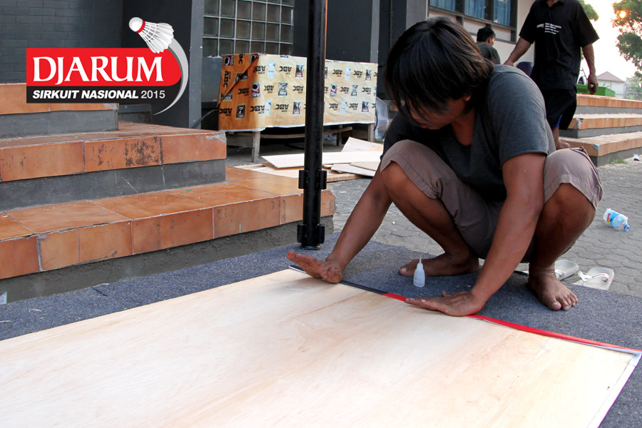 Seoarang pekerja saat memasang perlengkapan dekorasi Djarum Sirkuit Nasional Li-Ning NTB Open 2015
