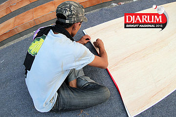 Salah satu pekerja saat memasang perlengkapan dekorasi Djarum Sirkuit Nasional Li-Ning NTB Open 2015