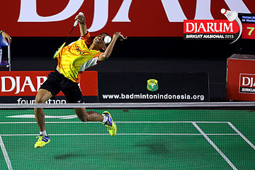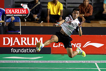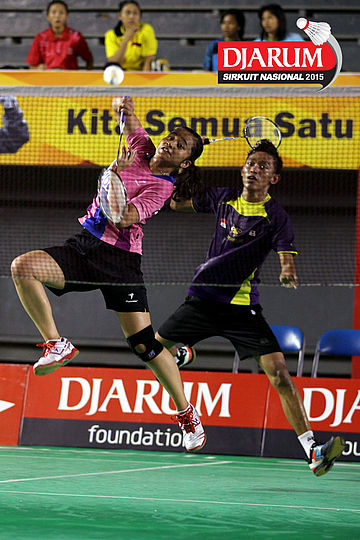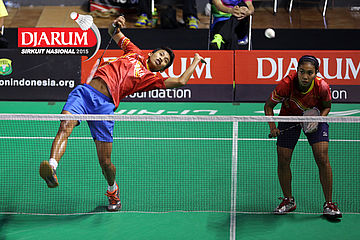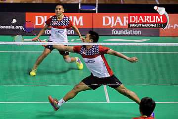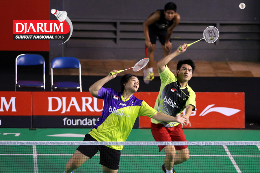 Danang Dwi/Aris Budiharti (Jaya Raya) mengembalikan shuttlecock.