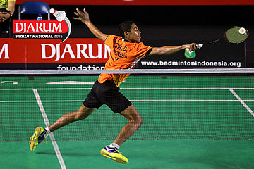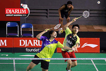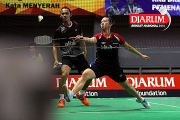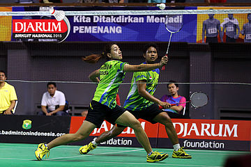 Tedi Supriadi/Ririn Amelia (Djarum Kudus) mengembalikan shuttlecock