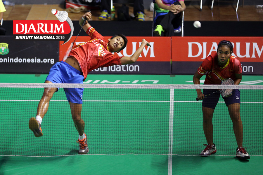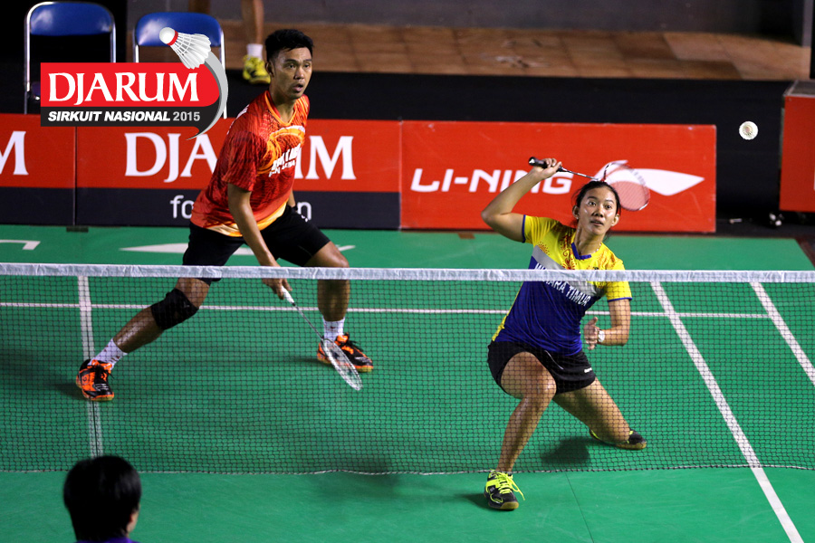 Irfan Fadhilah/Weni Anggraini (Jaya Raya) menghadang serangan