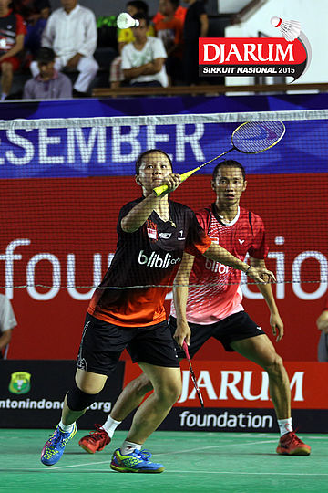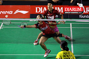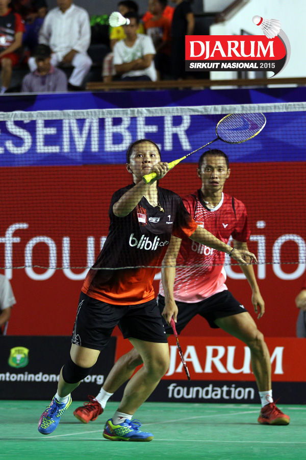 Ardy Nugroho/Lisa Ayu (Djarum Kudus) mengembalikan shuttlecock