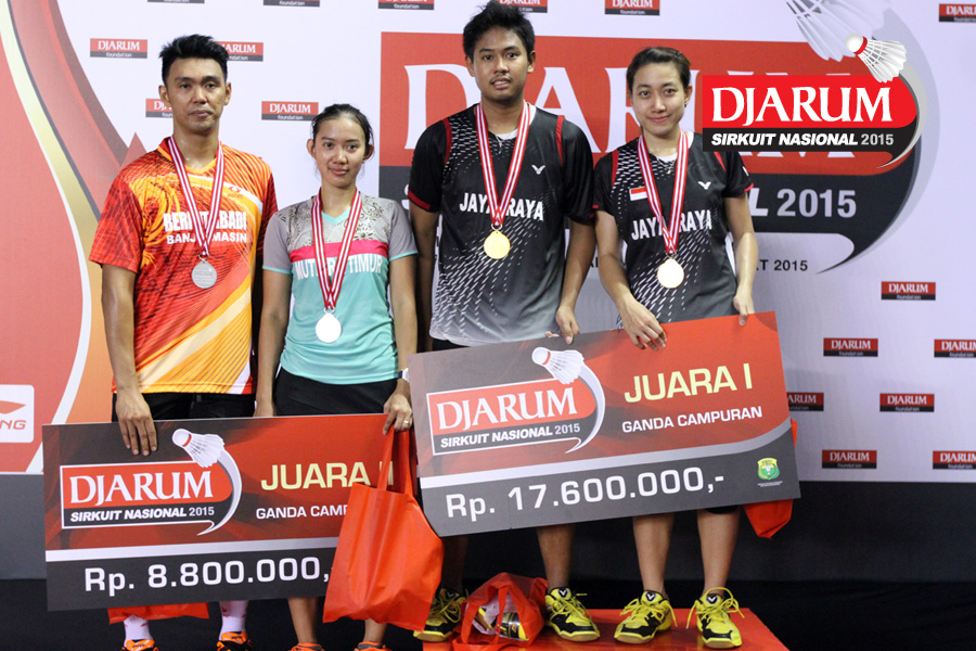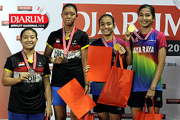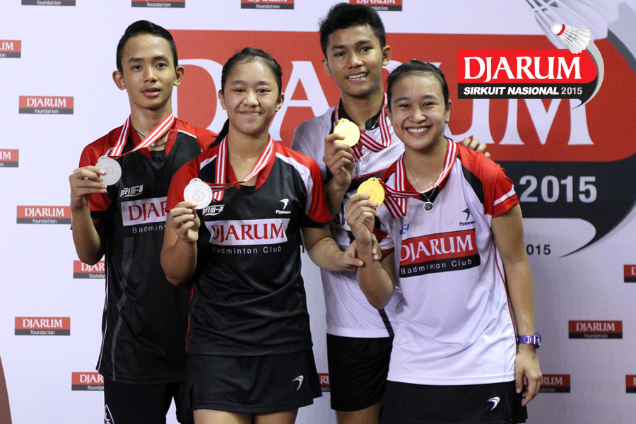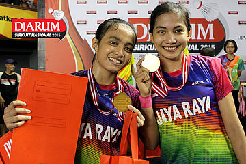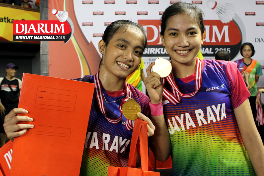 Syifa Fauziah/Virny Putri (Jaya Raya) memamerkan medali emasnya