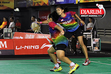 Cynthia Shara/Rofahadah Supriadi (Djarum Kudus) mengembalikan shuttlecock