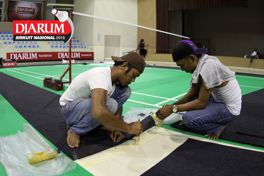 Salah satu pekerja memasang dekorasi Djarum Sirkuit Nasional 2015.