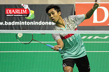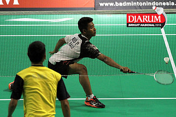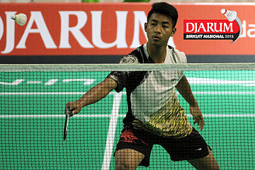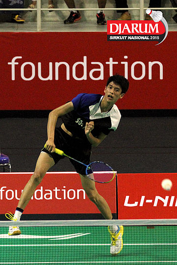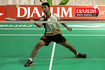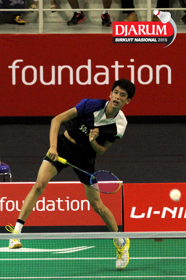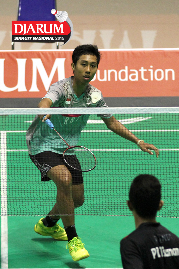 Rio Purwanto (Pusdiklat SMAN Olahraga Riau) mengembalikan shuttlecock.