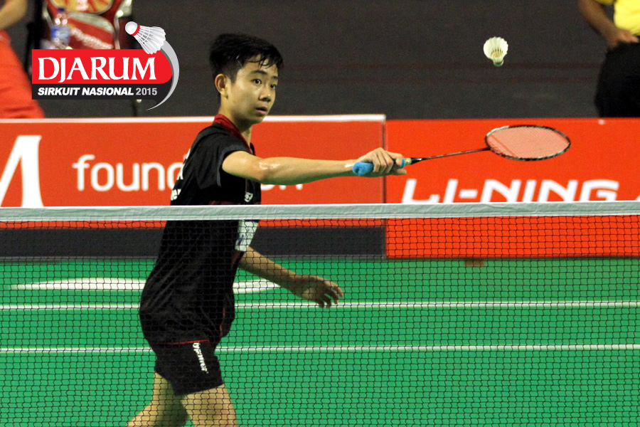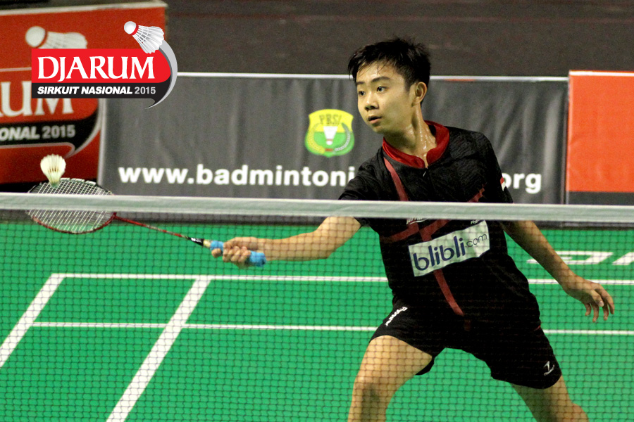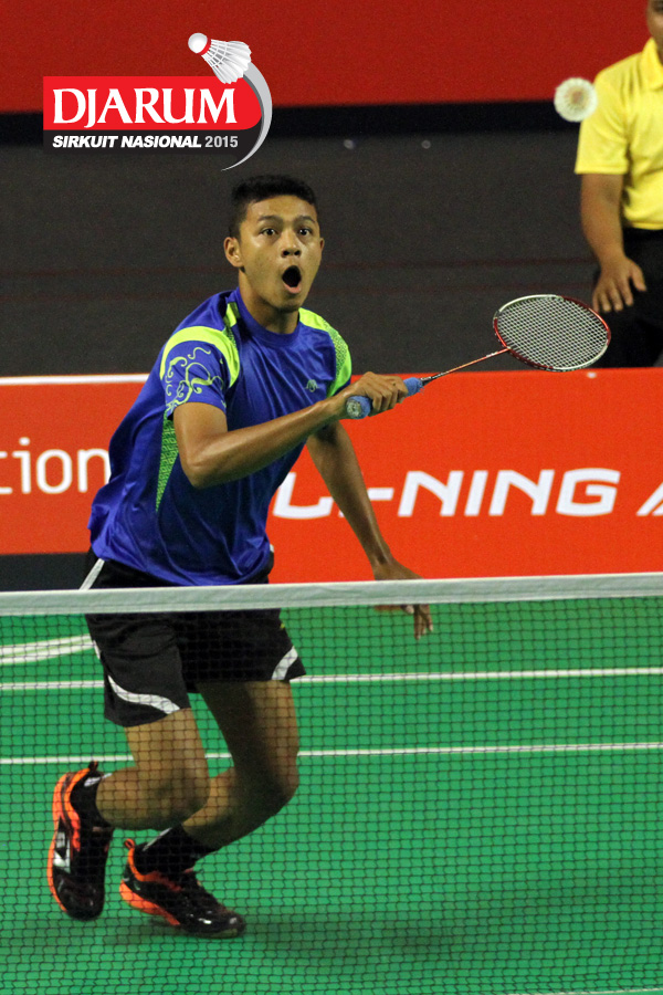 Tri Cahyo (Djarum Kudus) mengembalikan shuttlecock.