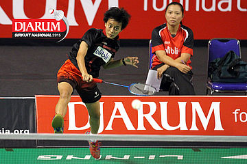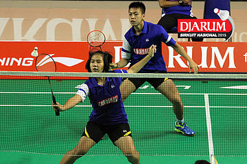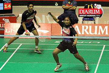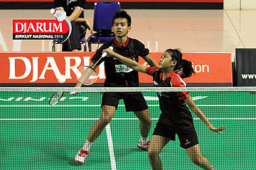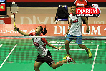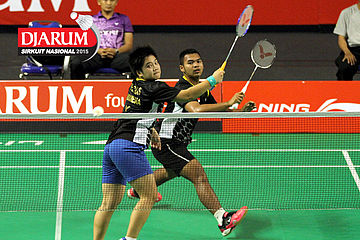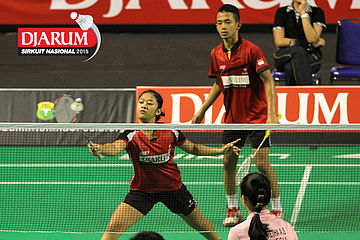 Brian Berri/Lisa Ayu (Djarum Kudus) menyambar pengembalian tanggung.