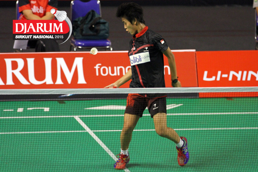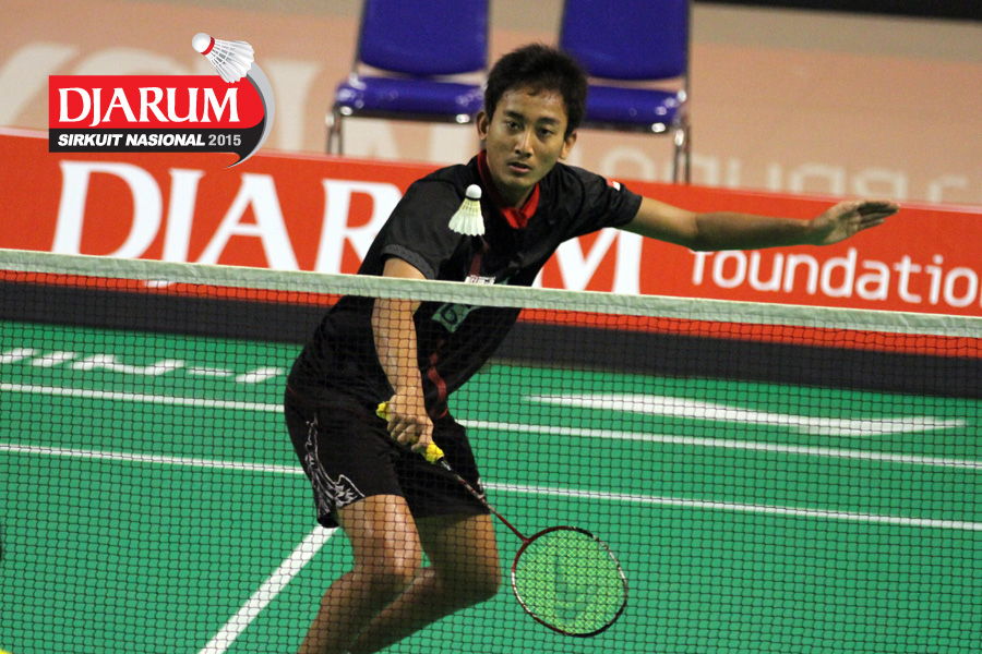 Vero Wisnu (Djarum Kudus) mengembalikan shuttlecock.
