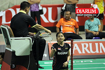 Novita Auliani (SKO Ragunan) meminta pergantian shuttlecock.