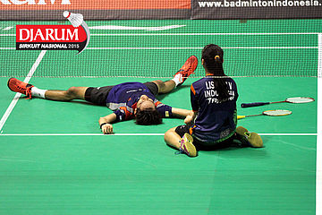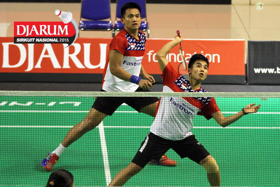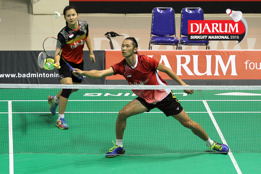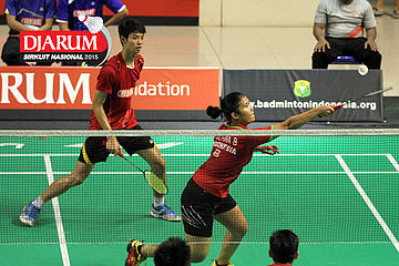 Afiat Yuris/Nadya Melati (Pertamina Fastron) bersiap menyambar pengembalian tanggung.