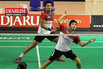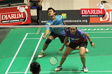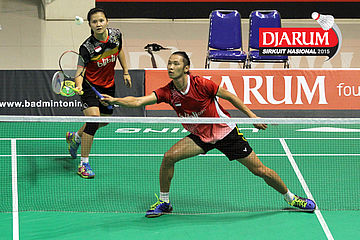 Fran Kurniawan/Komala Dewi (Djarum Kudus) mengembalikan shuttlecock.