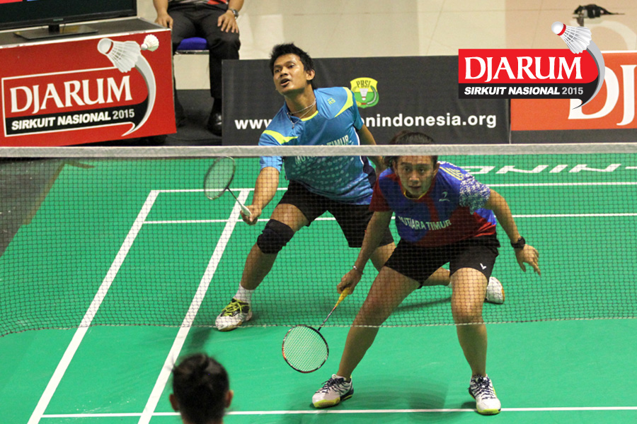 Didit Juang/Keshya Nurvita (Mutiara Timur) mengembalikan shuttlecock.