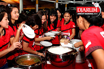 Beberapa pebulutangkis Jaya Raya Suryanaga bersiap menyantap makan malam yang tersaji di dalam acara Welcome Dinner Djarum Sirkuit Nasional Li-Ning Sulawesi open 2014 di Rumah Jabatan Gubernur Sulawesi Selatan.