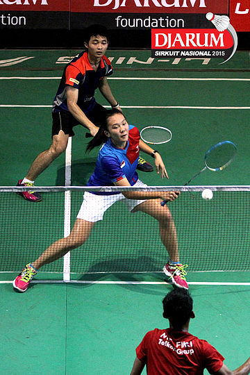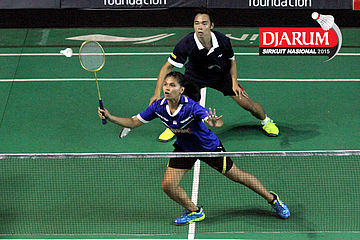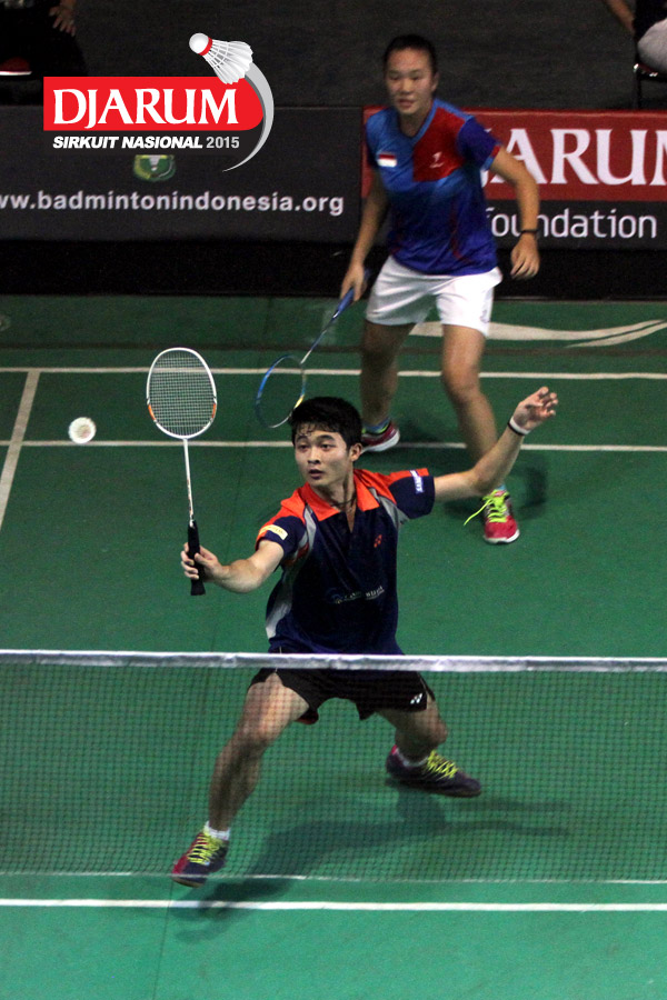 Meldrick Rurado/Monica Nggilu (Candra Wijaya/Mutiara Cardinal) bersiap menyambut pengembalian dari Yohanes Rambitan/Maria Nathalia (Kasih/Focus).