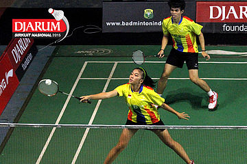 Kelvin Valentino/Vehrenica Debora (Candra Wijaya/Tangkas) mengembalikan shuttlecock ke arah M. Shohibul Fikri/Tria Nur (Pusdiklat Telkom Jabar).