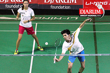 M. Shohibul Fikri/Tria Nur (Pusdiklat Telkom Jabar) menyambut pengembalian dari Kelvin Valentino/Vehrenica Debora (Candra Wijaya/Tangkas).