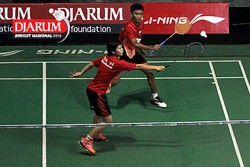 M. Shohibul Fikri/Tria Nur (Pusdiklat Telkom Jabar) mengembalikan shuttlecock ke arah Kelvin Valentino/Vehrenica Debora (Candra Wijaya/Tangkas).