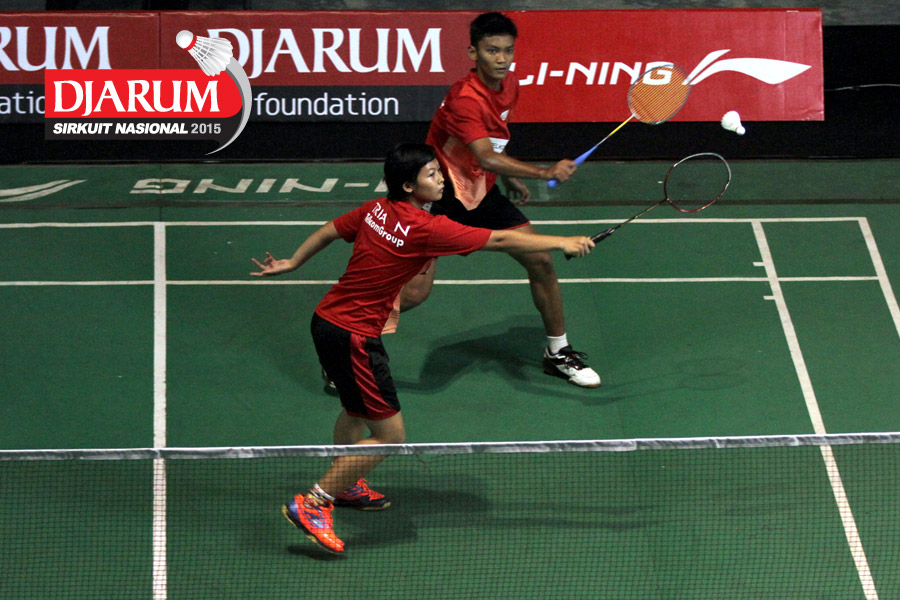 Ardy Nugroho/Agatha Imanuela (Djarum Kudus) mengembalikan shuttlecock ke arah Alan Muhammad/Dhiva Agretha (JR Enkei/SKO Ragunan).