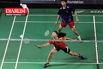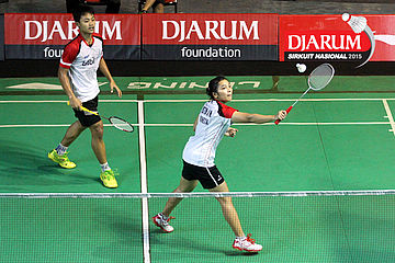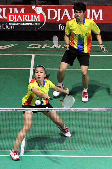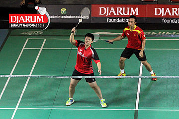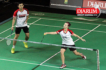 Tedi Supriadi/Ririn Amelia (Djarum Kudus) menyambut pengembalian dari Hiski Rumengan/Wati (Suryanaga Surabaya/Icli Gowata Sulsel).