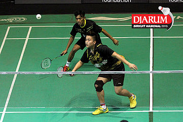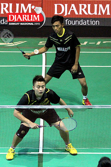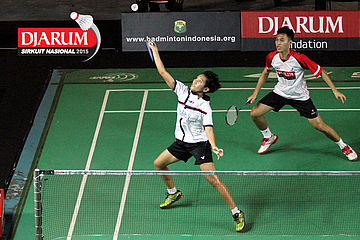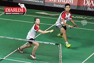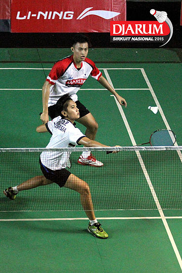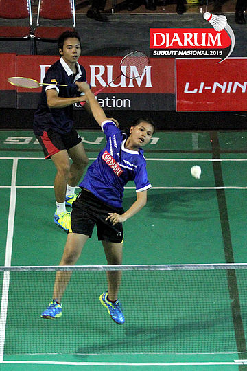 Trikusuma Wardhana/Meiliana Jauhari (Suryanaga Surabaya/Djarum Kudus) bersiap menyambar pengembalian tanggung dari Rendy/Ulfina (Billionaires Gorontalo).