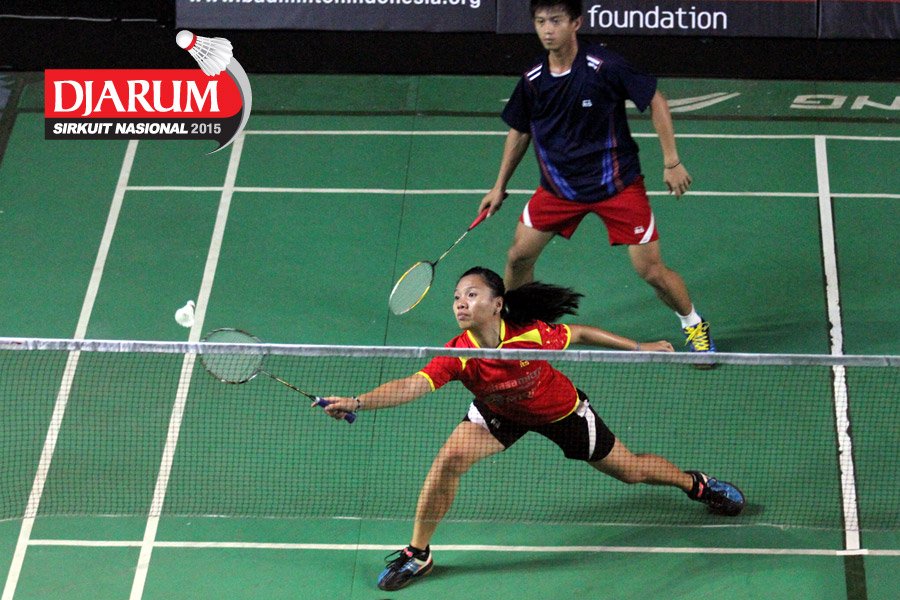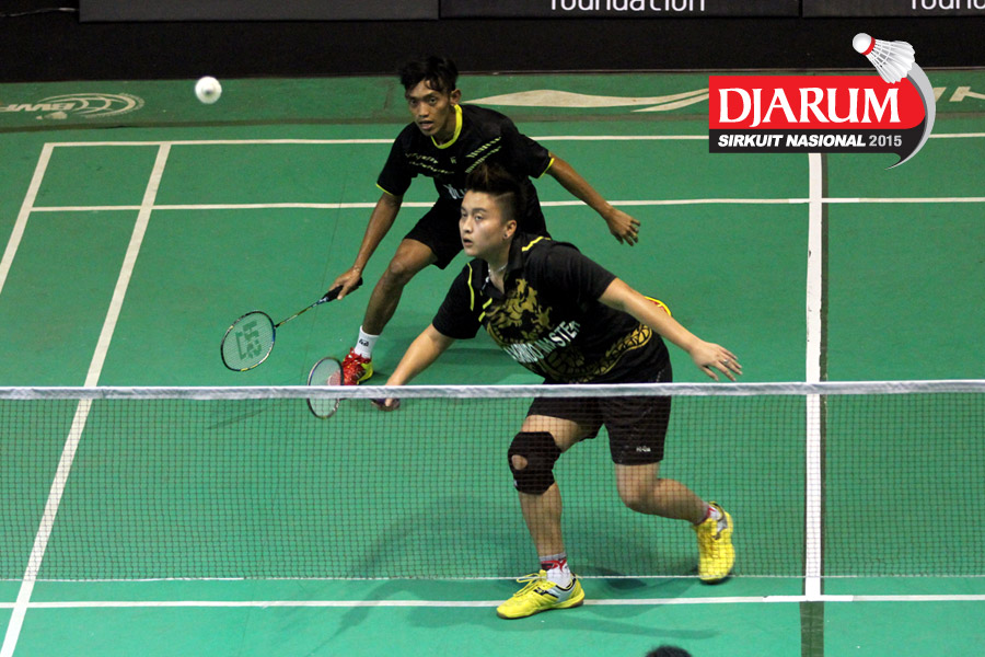 Akbar Bintang/Ristya Ayu (Djarum Kudus) mengembalikan shuttlecock ke arah Meyky Donggala/Monalisa Nggilu (Winner BC Manado).