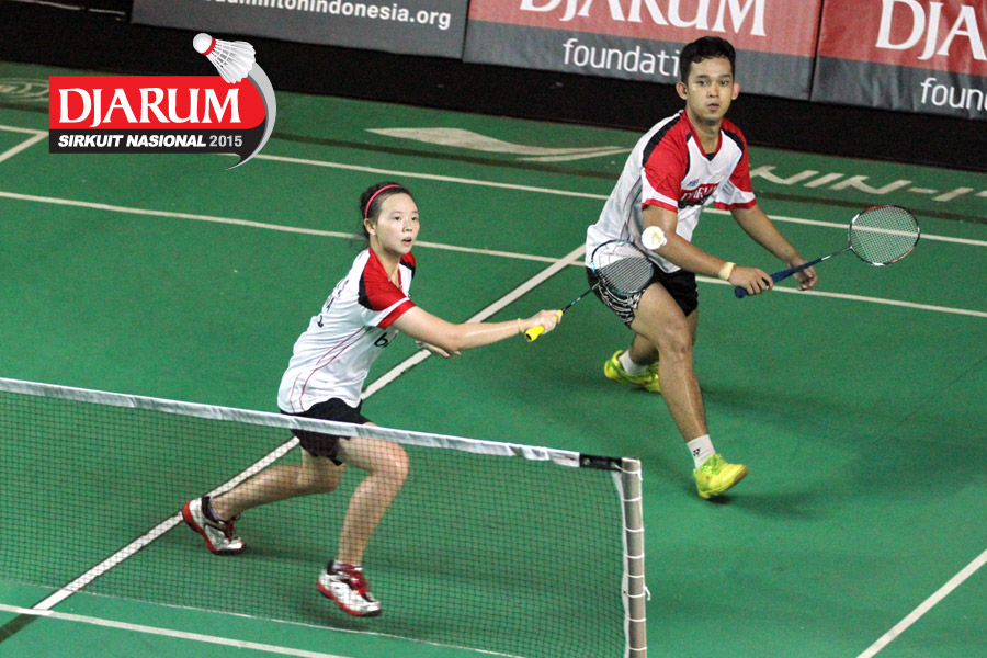 Tedi Supriadi/Ririn Amelia (Djarum Kudus) mengembalikan shuttlecock ke arah Hiski Rumengan/Wati (Suryanaga Surabaya/Icli Gowata Sulsel).