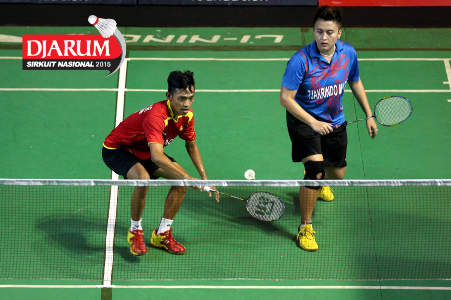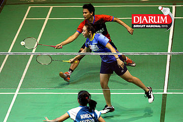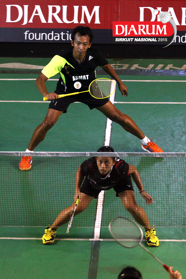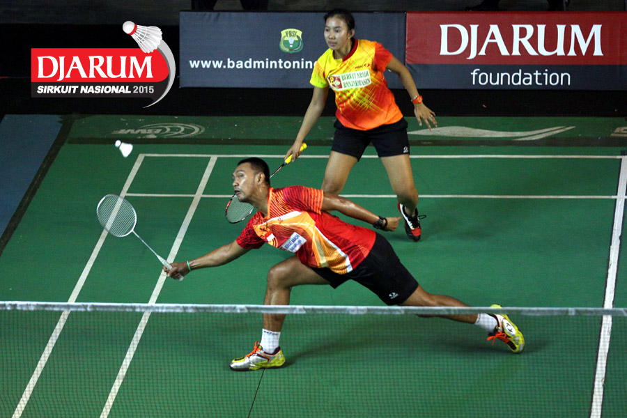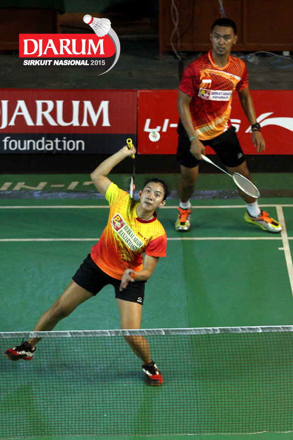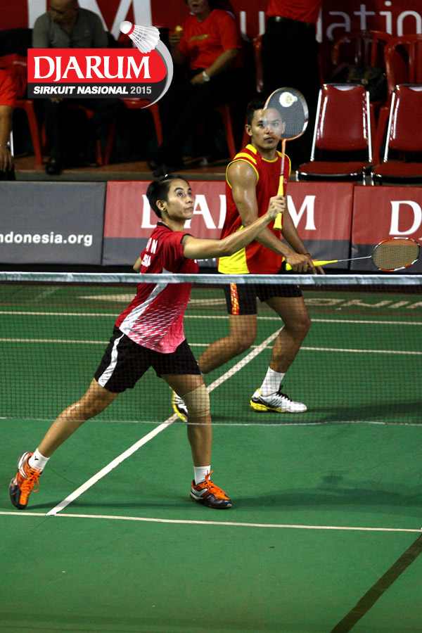 Akbar Bintang/Ristya Ayu (Djarum Kudus) bersiap menghadang serangan yang dilepaskan Anggun Nugroho/Dian Fitriani (Halim/Pertamina Fastron).