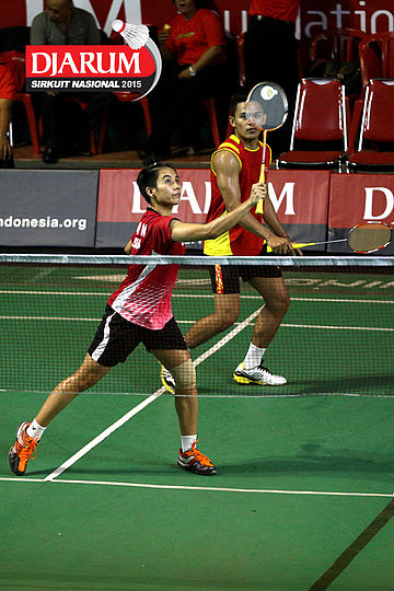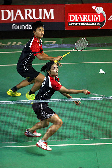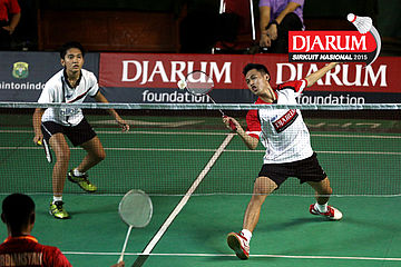Akbar Bintang/Ristya Ayu (Djarum Kudus) menyambut pengembalian dari Anggun Nugroho/Dian Fitriani (Halim/Pertamina Fastron).