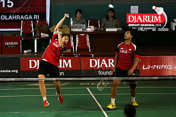 M. Rijal/Shendy Puspa (Djarum Kudus) melepaskan smash ke arah Kezia Kembuan/Jeksen (Winner BC Manado).