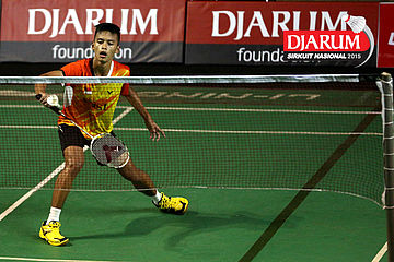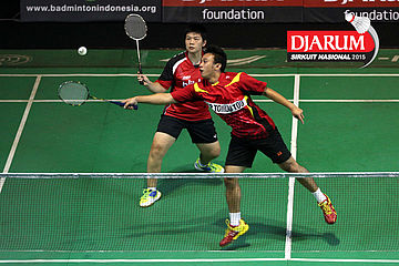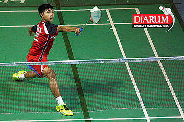 Bagas Kristianto (Djarum Kudus) mengembalikan shuttlecock ke arah Fatturrahman Fauzi (Exist).