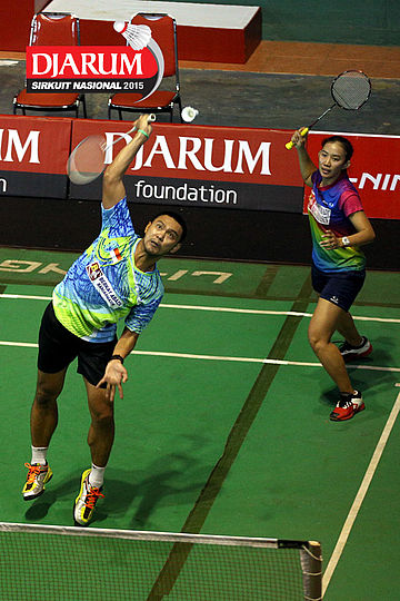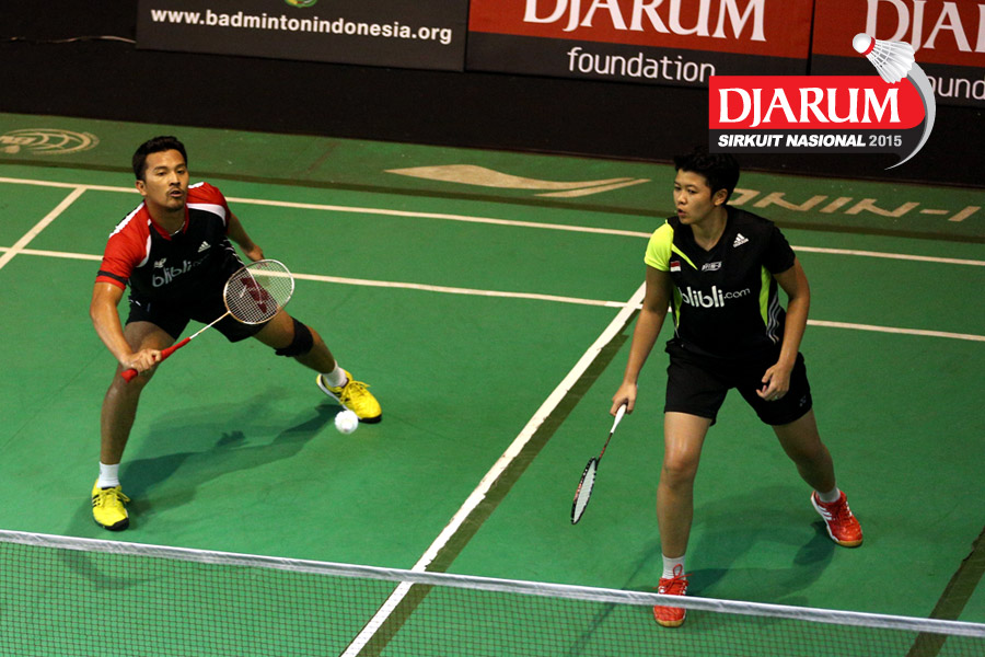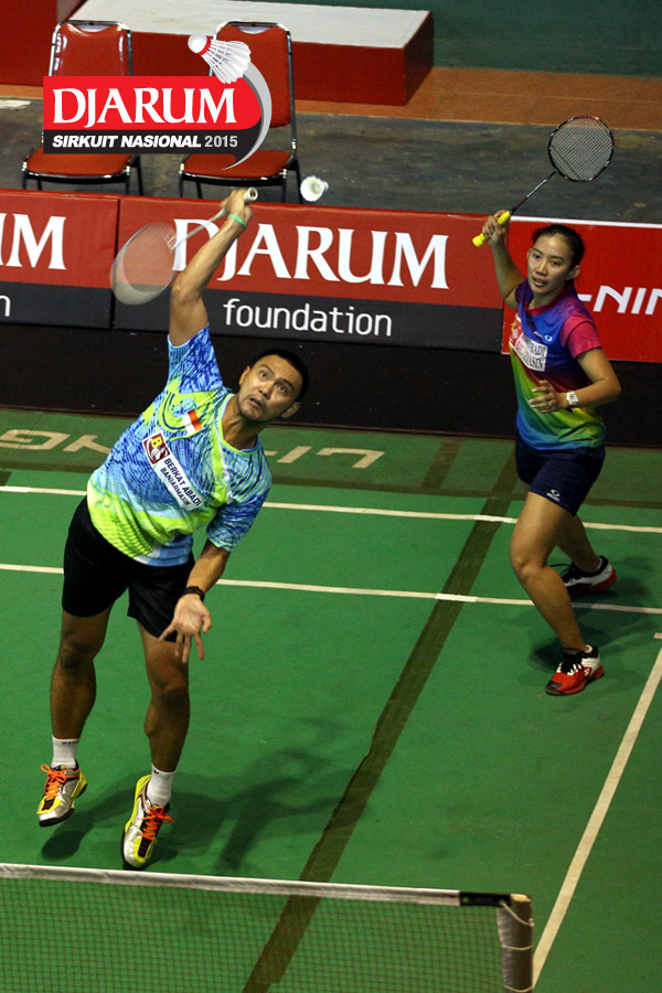 Jeka Wiratama/Della Augustia (Djarum Kudus) bersiap menyambar pengembalian tanggung dari Trikusuma Wardhana/Meiliana Jauhari (Suryanaga/Djarum Kudus).
