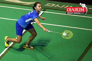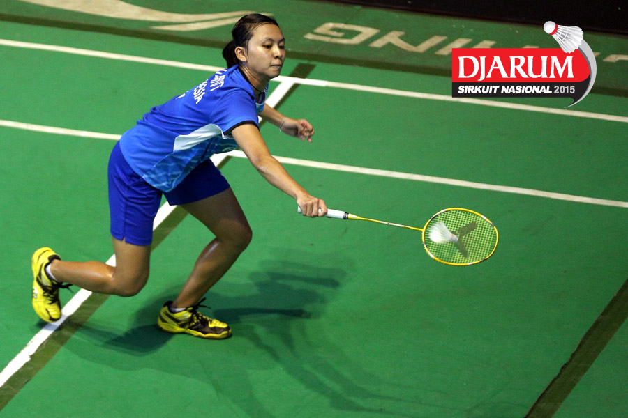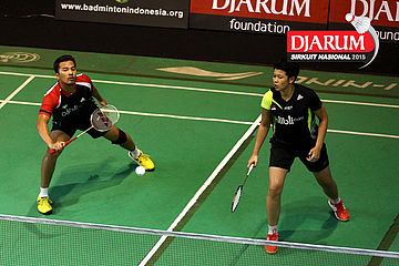 Ardiansyah Putra/Devi Tika Permatasari (Berkat Abadi) mengbalikan shuttlecock ke arah M. Rijal/Shendy Puspa (Djarum Kudus).