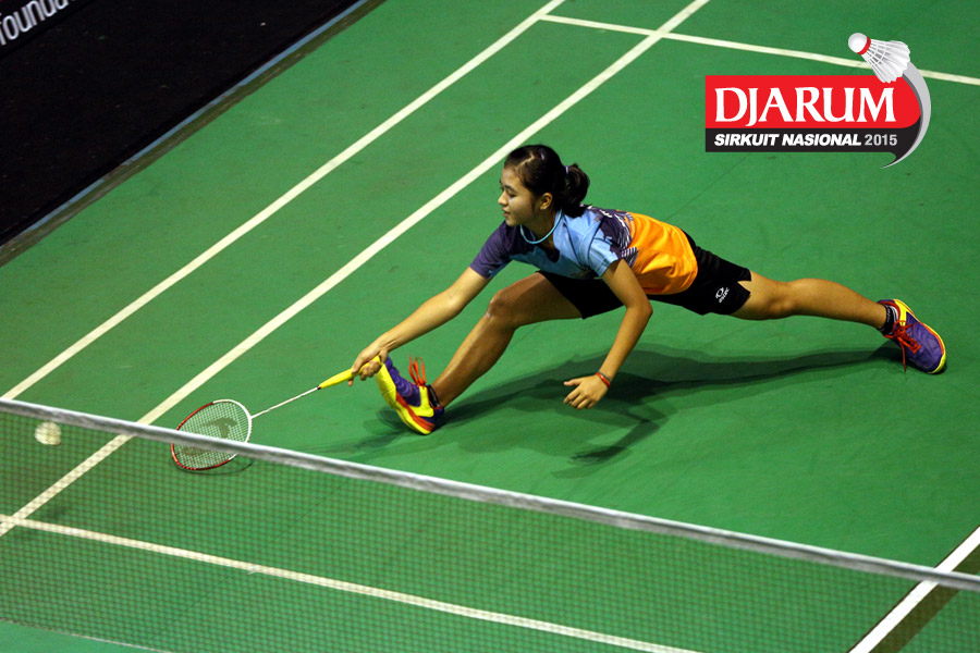 Winda Puji (FIFA Badminton) mengembalikan shuttlecock ke arah Vioni Florencya (Tangkas).