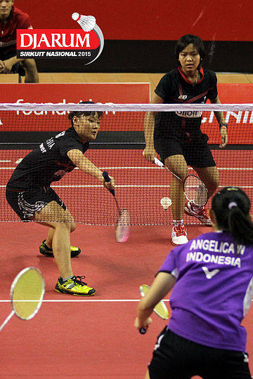 Aisyah Nuraini/Angelica Wiratama (Exist) bersiap menghadang serangan yang dilepaskan Agatha Imanuela/Siti Fadia (Djarum Kudus)