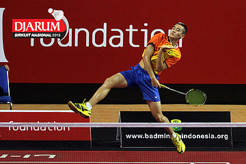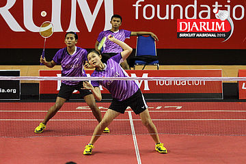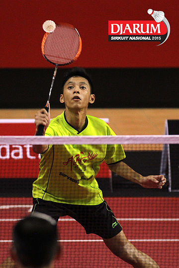 Ramadhani M. Zulkifli (Djarum Kudus) melepaskan smash ke arah M. Ahdial Okta (Pelatprov PBSI DKI Jakarta)