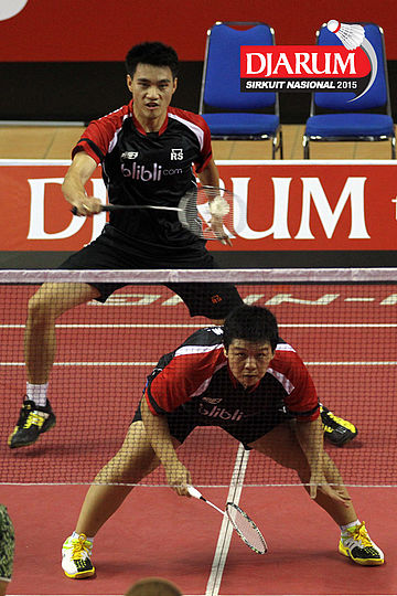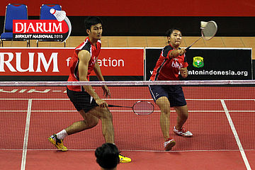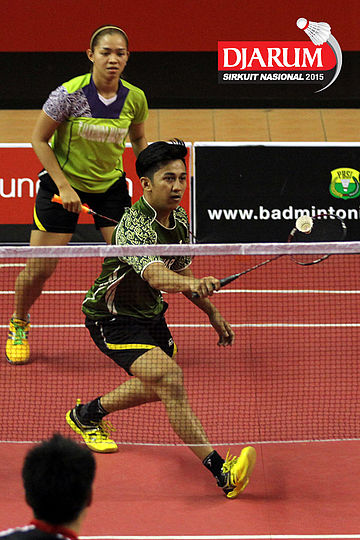 Ridho Akbar/Ery Octaviani (Halim/Jaya Raya) bersiap menghadang serangan yang dilepaskan Kaisar Bobby/Delis Yuliana (Anugrah Jakarta)