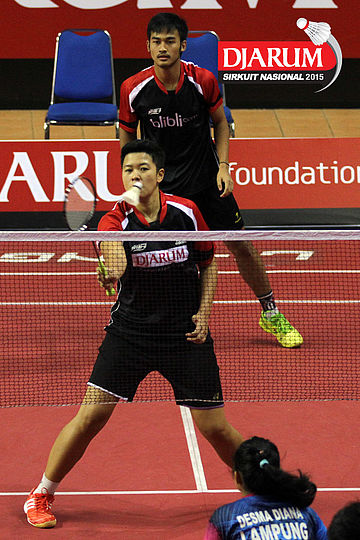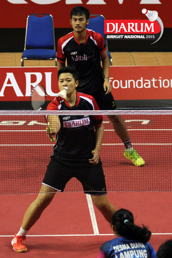 Ragawa Tamasuta/Berliyan Sudrajat (Semen Gresik) mengembalikan shuttlecock ke arah Muhammad/Ganis Nurrahmandani (Pertamina Fastron)
