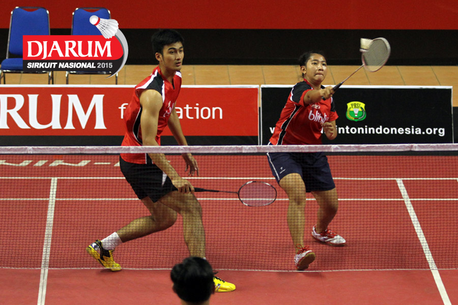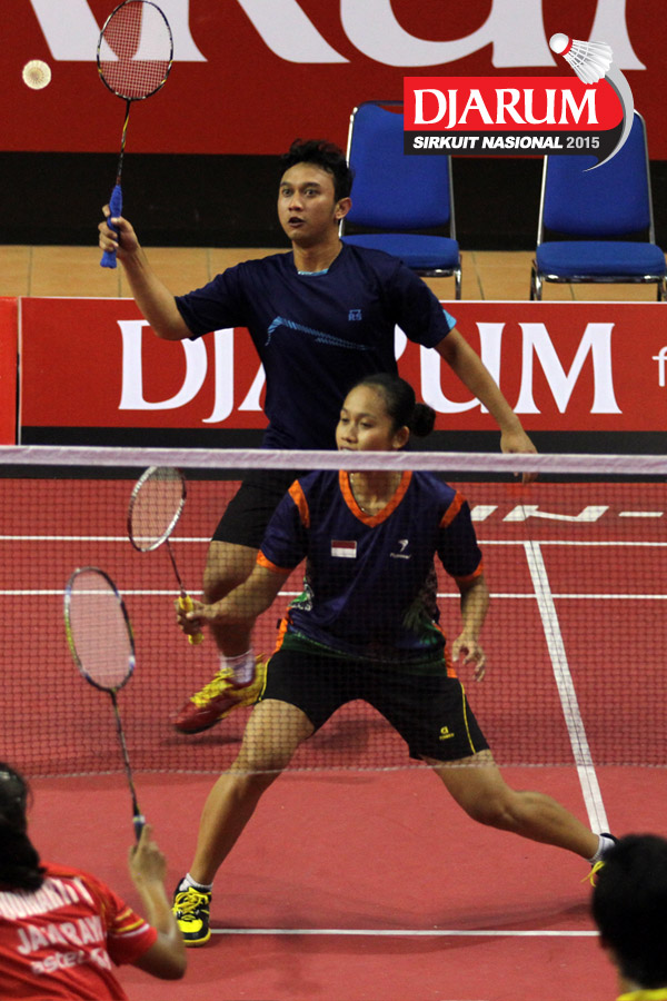 Rendra Wijaya/Meiliana Jauhari (Djarum Kudus) menghadang serangan dari Rizko Azuro/Febby Angguni (Guna Dharma/Tjakrindo Masters)